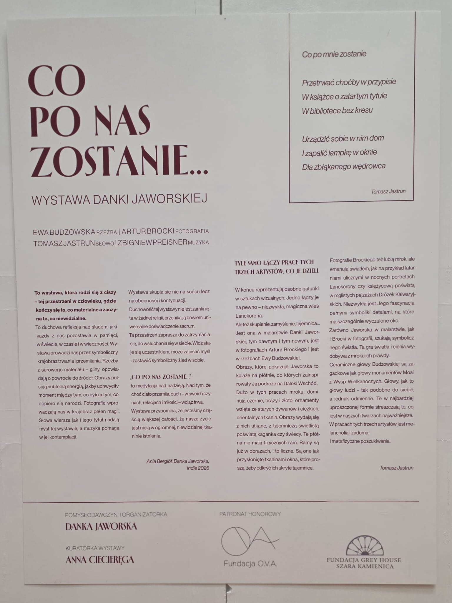In the heart of Krakow, within the walls of the historic Palace of Art, the opening of the exhibition „What remains of us...” took place. The O.V.A. Foundation is an honorary patron of this unique event, the originator and organiser of which is Danka Jaworska. The vernissage brought together art lovers, artists and friends of Lanckorona - a place which has become the spiritual and artistic axis of this exhibition.
